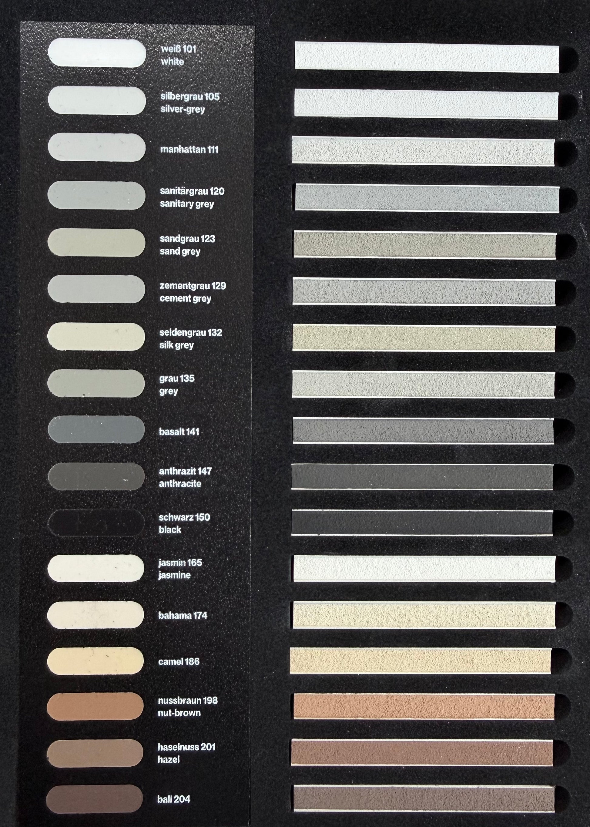 weiss, silbergrau, manhattan, sanitärgrau, sandgrau, zementgrau, seidengrau, grau, basalt, anthrazit, schwarz, jasmin, bahama, camel, nussbraun, haselnuss, bali